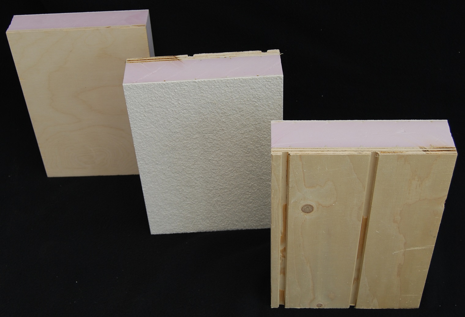 2 mm putsad yta, 12 mm spårad plywood, 6 mm slät plywood